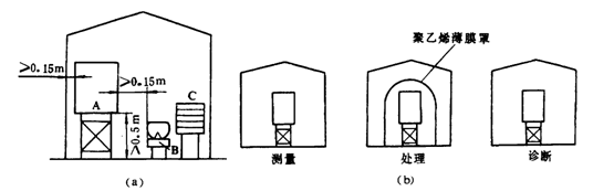 指示器应垂直固定,面对试品的操作面。必要时,应同时装设在易被人触及的各面。它应装设在高度为2m及以下,且与试品相距300±15mm,面对气体可能喷出的各点(如接缝处、观察窗、门等)。在距地面2m高、距试品0.3~0.8m处还应装设水平放置的指示器,见图A2。