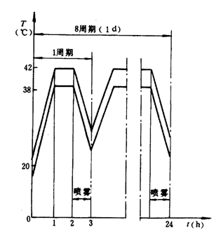 人工气候试验室内的温度应在3h内从(25±3)℃上升到(40±2)℃。温度在(40±2)℃保持2h,然后在1h内降到(25±3)℃。最高温度和最低温度之差应保持在(15±2)℃。然后温度在(25±3)℃保持2h。