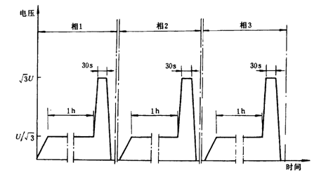 对一相施加 的电压(U是设备的额定电压),其他两相接地并且连接到设备的保护导体上。1h后,电压升到 且保持30s(电压上升率为0.5~0.7kV/s之间),应连续依次地在其他两相上重复此试验,试验间隔应尽可能短。