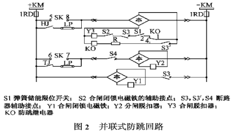 所谓并联式防跳, 即防跳继电器KO 的电压线圈并联在断路器的合闸回路上(如图2 所示)。例如一个持久的合闸命令存在时, 合闸整流桥输出经Y3, S2, S3, S1, KO (2—1) 接通。断路器合闸后, 并联在合闸回路的辅助接点S3′闭合, 启动防跳继电器KO , KO 接点即由2—1 位置切换到4—1 位置, 断开合闸回路并保持。若此时线路或设备故障, 继电保护动作跳闸。但由于合闸回路已可靠断开, 从而防止了开关跳跃。