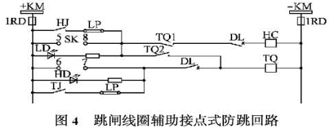 断路器多采用并联式防跳回路。其中串联式防跳回路最合理, 应用也最广泛, 它除具有防跳功能外, 还具有防止保护出口接点断弧而烧毁的优点, 这也是应用微机保护装置不可缺少的技术条件。其他防跳回路只具有防止断路器跳跃的功能, 跳闸线圈辅助接点式防跳回路在执行防跳功能时, 跳闸线圈长期带电有可能烧毁。