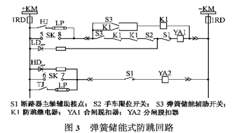 如图3, 当一个持久合闸命令到来时, 合闸电流经SK 或HJ 通过S3, K1, K1, S2, S1, YA 1 接通开关合闸。合闸后弹簧机构开始储能, 并联在合闸回路的弹簧储能辅助开关S3 常闭点接通防跳继电器K1, K1 的常开点自保, 常闭点断开合闸回路。若此时线路或设备故障, 继电保护动作跳闸, 由于合闸回路已可靠断开, 有效地防止了开关跳跃。