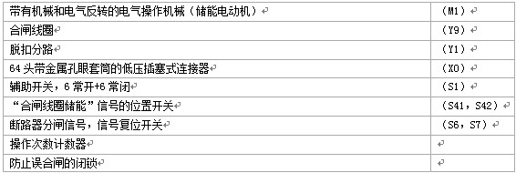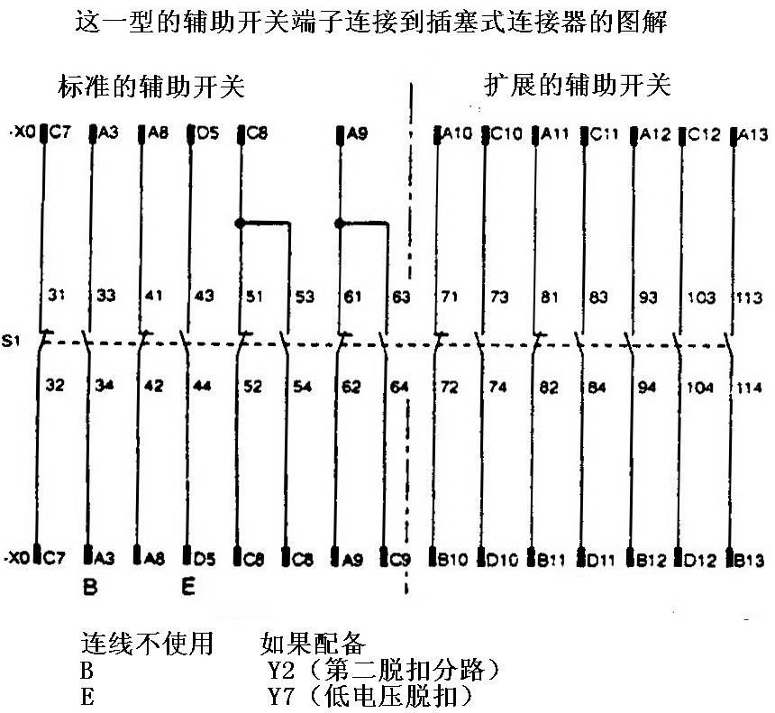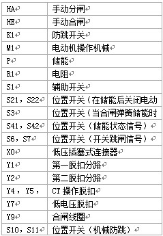 低电压脱扣 Y9 合闸线圈 S10,S11 位置开关(机械防跳) 图3/4低电压脱扣Y7的典型连接电路 功能原理图 图3/5手动电气合闸64路插头连接的3AH3真空断路器 HA 手动分闸 HE 手动合闸 K1 防跳开关 M1 电动机操作机械 P 储能 R1 电阻 S1 辅助开关 S21,S22 位置开关(在储能后关闭电动机) S3 位置开关(当合闸弹簧储能时打开) S41,S42 位置开关(储能状态信号) S6,S7 位置开关(开关跳闸信号) X0 低压插塞式连接器 Y1 第一脱扣分路 Y2 第二脱扣分路 Y4,Y5,Y6 CT操作脱扣 Y7 低电压脱扣 Y9 合闸线圈 S10,S11 位置开关(机械防跳)