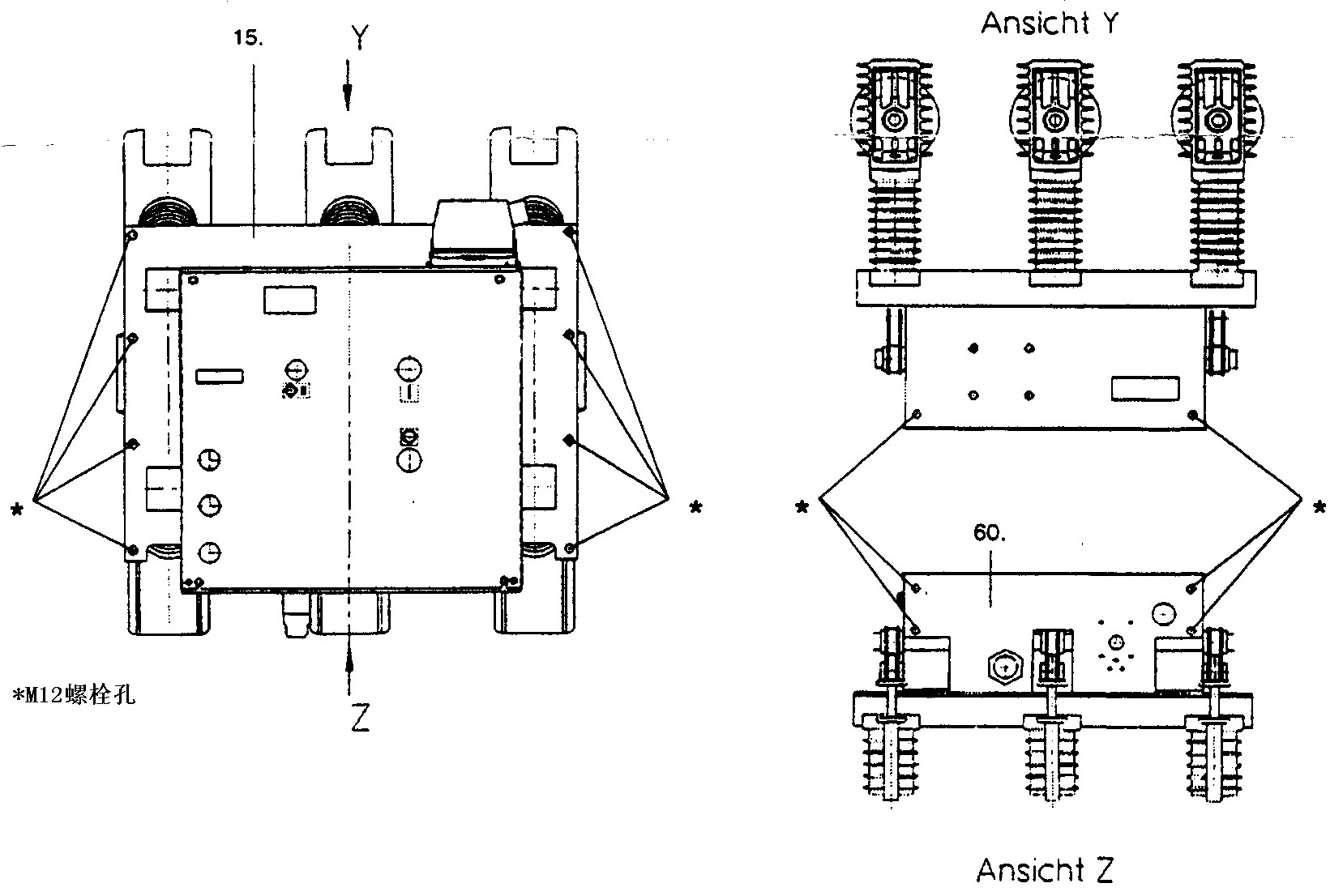 除标准的脱扣分路外,3AH3真空断路器也可以最多安装两个3AX11型脱扣分路。 安装 在配电柜或手车上安装 供应的3AH3真空断路器是敞开的,可以看到“和闸弹簧脱扣”指示。在安装3AH3真空断路器之前,先移走运输设备(制动器和定位器)。根据提供的图纸,面向松开的相间隔板安装。 在将3AH3真空断路器安装进柜中或手车上之前,检查它的额定铭牌数据(避免混乱),比较交货单指明的额定电压与本地可供的电源电压。 在带有低电压脱扣(Y7)3AX1103的真空断路器上,榔头的制动螺钉必须由位置A移到位置B(见真空断路器机械柜[60.]中的注意卡)。 在柱状板(15.)和机械柜(60.)上共有14个安装孔适应各种各样的型号断路器的安装(图3/1)。对于额定短路开断电流≥50KA的真空断路器的安装,我们推荐仅使用柱状板。 使用M12的固定螺栓-强度8级-严格参照尺寸图指示安装。 支架或框架必须满足操作条件,有足够的承载能力和稳定性。