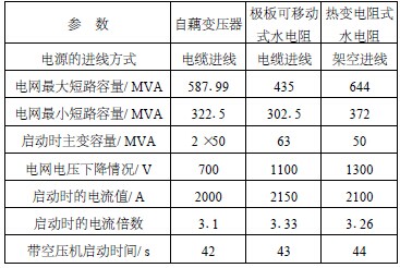 5 3 种启动方式的比较和分析 根据目前实际采集到的启动曲线情况来看, 这3 种启动方式都无特别明显的优势和特别大的区别, 3 种不同的启动方式将电网的压降值都控制在电网允许的范围内, 启动电流的倍数都控制在额定电流的3 倍左右, 启动时间都控制在42~45 秒内。由于各地现场的情况不完全一致, 实际运行情况肯定受其他启动因素的影响, 所以认为这3 种启动方式都是大型电机比较理想的启动方式, 其对电网产生的压降大小除了和当地电网容量有很大关系外,和其上级主变压器的容量也有密不可分的关系。采取不同的电机启动方式启动空压机时的技术参数比较见表1 。 表1 采取不同的电机启动方式启动空压机时的技术参数