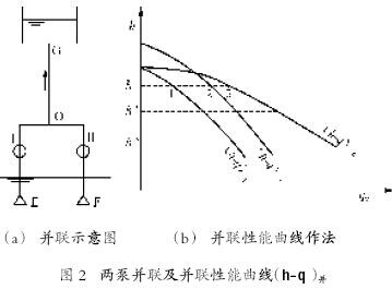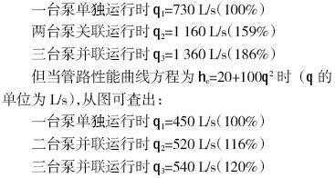 1 风机水泵的并联运行 泵或风机并联运行的主要目的是增大所输送的流量。但流量增加的幅度大小与管路性能曲线的特性及并联台数有关。图1所示为两台及三台性能相同的20Sh-13型离心泵并联时,在不同陡度管路性能曲线下流量增加幅度的情况,从图可见,当管路性能曲线方程为 从图中查得:
