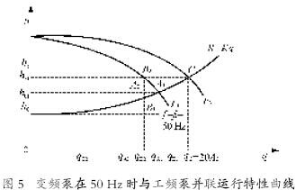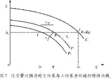 比较两组数据可以看出:管路性能曲线越陡,并联的台数越多,流量增加的幅度就越小。因此,并联运行方式适用于管路性能曲线不十分陡的场合,且并联的台数不宜过多。若实际并联管路性能曲线很陡时,则应采取措施,如增大管径、减少局部阻力等,使管路性能曲线变得平坦些,以获得好的并联效果。  1.1 并联泵(或风机)的性能曲线(h-q)或(p-q)两台或两台以上泵(风机)向同一压出管路压送流体的运行方式称为并联运行,如图2 所示。 泵(或风机)并联运行的基本规律是:并联后的总流量应等于并联各泵流量之和;并联后产生的扬程与各泵产生的扬程都相等。因此,泵(风机)并联合成后的性能曲线(h-q)并或(p-q)并的作法是:把并联各泵(或风机)的(h-q)或(p-q)曲线上同一扬程(或全压)点上流量值相加,以图2(a)两台泵并联为例,先把这两台泵的性能曲线(h-q)1 和(h-q)2以相同的比例尺绘在同一坐标图上,然后把各个同一扬程值的流量分别相加,如图2(b)所示,取扬程值为h、h'、h〃、……,对应于(h-q)1 和(h-q)2,上分别为1、1'、1〃……和2、2′、2″……取q1+ q2、q1'+ q2'、q1〃+q2〃……得3、3′、3″……连接3、3′、3″……各点即得合成后泵并联性能曲线(h-q)并,同法可得风机并联性能曲线。 1.2 并联泵(或风机)中的一台进行变速调节的并联 运行工况点如图3所示,Ⅰ、Ⅱ两台性能相同的泵并联运行。但泵Ⅰ与泵Ⅱ有一台为变速泵,另一台为定速泵。当变速泵与定速泵以相同的额定转速运行时,Ⅰ和Ⅱ的并联性能曲线(h-q)并为Ⅲ,并联运行工况点为M。但当变速泵的转速降低时,并联性能曲线变为如图3中的虚线所示,其并联运行工况点也相应地变为M′、M″、……从图3可以看出,当变速泵的转速降低时,变速泵的流量减小,但定速泵的流量却增大。当变速泵的转速降低到某一转速值时,其输出流量为零,这时并联运行实际上相当于一台定速泵单独运行。若变速泵转速进一步降低,且变速泵出口管路又未设置逆止阀时,就会出现定速泵部分流量向变速泵倒灌,这种现象在实际上是不容许产生的。从图可见,当变速泵的转速由额定转速降低到该泵输出流量为零的转速时,定速泵的流量将由qN增大到qB,这可能会导致定速泵产生过载或泵内汽蚀。为防止定速泵的过载和汽蚀,可在定速泵出口管路设置调节阀,必要时控制其流量。  2 供水系统的水泵运行工况分析 2.1 多泵并联运行 一般的供水系统都采用多台泵并联运行的方式,并且采用大小泵搭配使用,目的是为了灵活的根据流量决定开泵的台数,降低供水的能耗。供水高峰时,几台大泵同时运行,以保证供水流量;当供水负荷减小时,采用大小泵搭配使用,合理控制流量,晚上或用水低谷时,开一台小泵维持供水压力。 多台并联运行的水泵,一般采用关死点扬程(或最大扬程)相同,而流量不同的水泵。这些泵并联运行时,每台泵的出口压力即为母管压力,且一定大于每一台泵单泵运时的出口压力(或扬程),即hN=hA2=hB2=hC2……>hA1、hB1、hC1……并联运行泵的总出口流量为每台泵出口流量之和,且每台泵的流量一定小于该泵单泵运行时的流量,即qN=qA2+qB2+qC2……<qA1+qB1+qC1……若并联运行的泵的扬程不同,则在并联运行时扬程低的泵的供水流量会比单泵运行时减小很多。 因此当管网阻力曲线变化时,容易发生不出水和汽蚀现象。 2.2 静扬程对调速范围的影响 供水系统的静扬程h0,即供水母管的最小压力,水泵在静扬程下消耗的功率称为空载功率:在流量为零时,水泵所消耗的最大功率。十分明显的是,静扬程越高,空载功率所占的比例越大,调速范围越小,调节转速的节能效果就越差。 静扬程可由水泵进水口和出水口的落差形成,也可由管网阻力曲线形成,也可由用户要求的供水压力来决定。如锅炉给水泵,必须大于汽包压力才能进水。当然也可由变/定水泵并列运行的定速水泵的出口压力造成。 2.3 变频泵与工频泵的并联运行分析 2.3.1 变频泵与工频泵并联运行时总的性能曲线 这时总的特性曲线与关死点扬程(最大扬程)不同,流量也不同的水泵并联运行时的情况非常类似,可以用相同的方法来分析,如图4所示。  1)F1为工频泵的性能曲线,也是变频泵在50 Hz下满负荷运行时的性能曲线(假定变频泵与工频泵性能相同),工频泵单泵运行时的工作点A1。 2)F2为变频泵在频率f2时的性能曲线,变频泵在频率f2单独运行时的工作点B1。 3)F3为变频和工频水泵并联运行的总的性能曲线,工作点C,扬程hC,流量qC=qA2+qB2。 2.3.2 变频泵与工频泵并联运行时的特点 1)F2不仅仅是一条曲线,而是F1性能曲线下方偏左的一系列曲线族。F3也不仅仅是一条曲线,而是在F1性能曲线右方偏上的一系列曲线族。 2)F2变化时,F3也随着变化。工作点C也跟着变化。因此变频泵的扬程hB2,流量qB2,工频泵扬程hA2 流量qA2,以及总的扬程hC= hB2= hA2,和总流量qC=qA2+qB2都会随着频率f2的变化而变化。 3)随着变频泵频率f2 的降低,变频泵的扬程逐渐降低。变频泵流量qB2快速减少;工作点C的扬程也随着降低,使总的流量qC减少;因此工频泵的扬程也降低,使工频泵流量qA2 反而略有增加,此时要警惕工频泵过载。 2.3.3 并联运行特性之一(f2 =f1 = 50 Hz) 变频泵与工频泵并联运行频率f2= f1=50 Hz的性能曲线,如图5所示。  1)F1为工频泵的性能曲线,也是变频泵在满负荷运行时的性能曲线(假定变频泵与工频泵性能相同),工频泵和变频泵单泵运行时的工作点A1。 2)F3