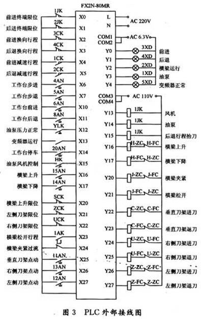 图3是PLC的外部接线图。输入部分可以分为外部工作环境、工作台运行、刀架控制和横梁运行四部分。输出点分为信号显示、交流接触器线圈控制和变频器控制三部分。