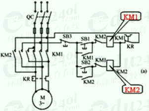 为此,只要用两个交流接触器就能满足这一要求,当正转接触器KMI工作时,电动机正转;当反转接KM2工作时,由于调换了两根电源线,所以电动机反转。