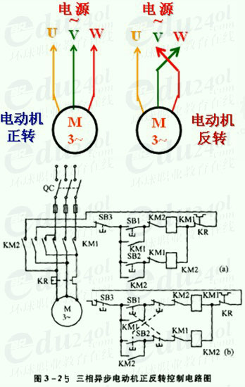三相异步电动机的正、反转方法:任意调换电源的两根进线,电动机反转。