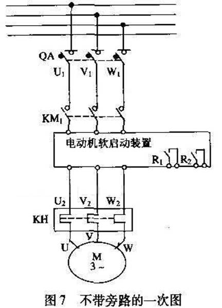 当电动机全速运行后,用旁路接触器来取代已完成任务的软起动器,以降低晶闸管的热耗,提高系统效率。在这种模式下用一台软起动器可以起动多台电动机。