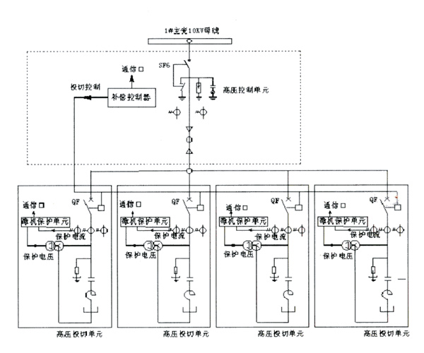 当这个物理量满足要求时,如COSΦ超前且≥0. 98,滞后且≥0. 95,在这个范围内,此时控制器没有控制信号发出,这时已投入的电容器组不退出,没投入的电容器组也不投入。当检测到COSΦ不满足要求时,如COSΦ滞后且≦0. 95,那么将一组电容器投入,并继续监测COSΦ如还不满足要求,控制器则延时一段时间(延时时间可整定),再投入一组电容器,直到全部投入为止。当检测到超前信号如COSΦ≦0.98,即呈容性载荷时,那么控制器就逐一切除电容器组。要遵循的原则就是:先投入的那组电容器组在切除时就要先切除。如果把延时时间整定为300S, 而这套补偿装置有十路电容器组,