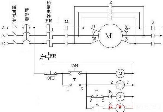 起动过程:合上隔离开关---合上断路器----按下ON启动按钮---M,S,T得电---M接通主回路,S通过T的常闭触点及R的常闭触点得电---S主回路接通--正在做起动运转过程。