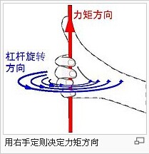 力矩等于作用于杠杆的作用力乘以支点到力的垂直距离。例如,3 牛顿的作用力,施加于离支点2 米处,所产生的力矩,等于1牛顿的作用力,施加于离支点6米处,所产生的力矩。力矩是个矢量。力矩的方向与它所造成的旋转运动的旋转轴同方向。力矩的方向可以用右手定则来决定。假设作用力垂直于杠杆。将右手往杠杆的旋转方向弯卷,伸直的大拇指与支点的旋转轴同直线,则大拇指指向力矩的方向(如图2)