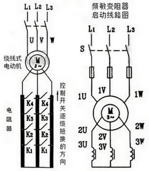 此法一般用于小容量的绕线式电动机上,当电动机容量稍大时则采用下图(左)中所示的电路,此时电阻不是均匀的减小而是通过接触器触头或凸轮控制器触头的开闭有级的切除电阻。这种启动方法的优点是不仅能减小电动机启动电流,而且能使启动转矩保持在较大的范围内,所以在需要重载启动的设备,如桥式起重机、卷场机、龙门吊车等上面被广泛采用。