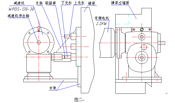 图二中,控制左溜板的下光杠要与横梁右端的传动机构脱开,手柄固定。减速机输入带伸出轴,便于手动调整。