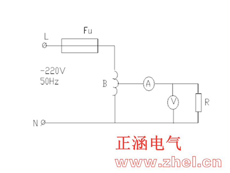 图中,FU:熔断器2A A:交流电流表5A,0.5级;B:调压器5KVA;V:交流电压表0.5级,测得的R值应接近R0计算值,允许有5%的误差。